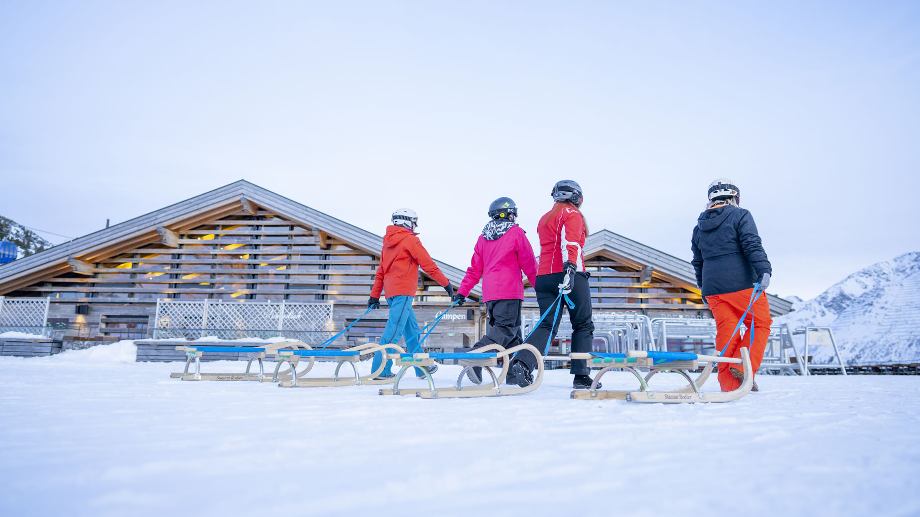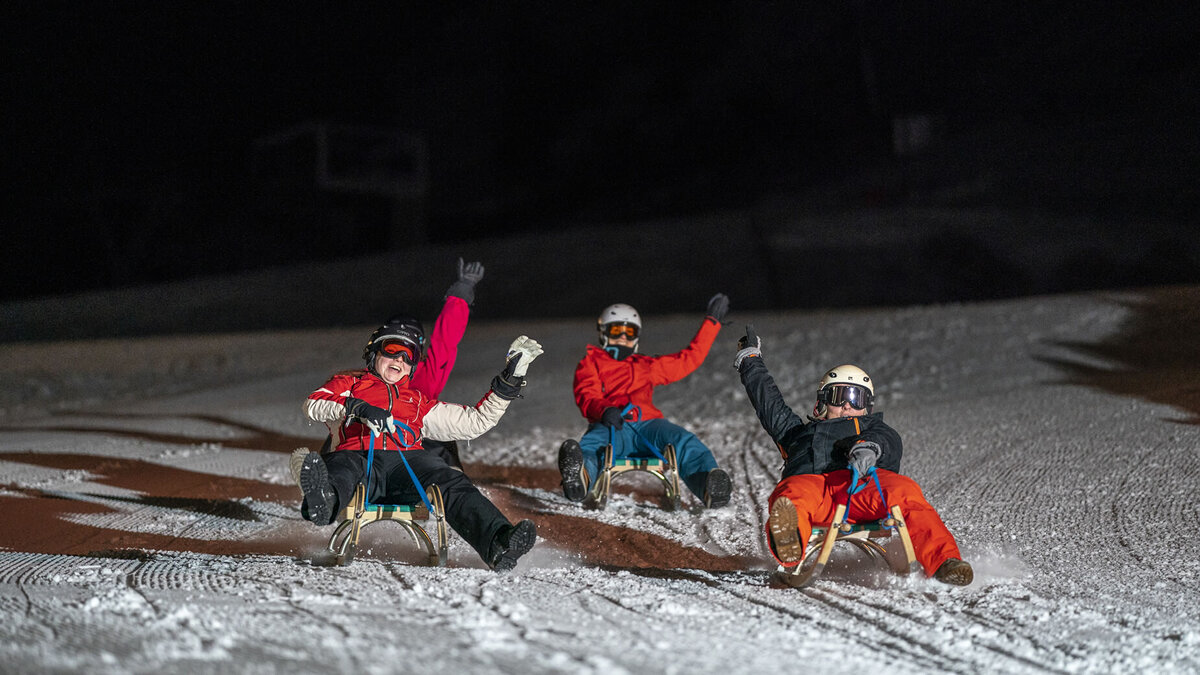 Rodeln macht Winterurlaub zur Action-Pause für die ganze Familie: Eine der längsten Naturrodelbahnen startet am Gampen auf etwa 1.850 m und führt rund 4 km hinab ins Tal – bequem mit der Gondel erreichbar.